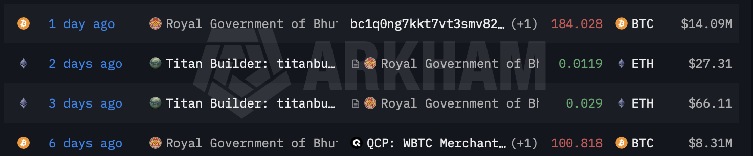 On February 4, Bhutan moved 184 BTC to a newly created address. Blockchain analysts note that such transfers often precede deposits to centralized exchanges or are used to facilitate over-the-counter (OTC) transactions, particularly when governments or large entities seek to minimize market impact.