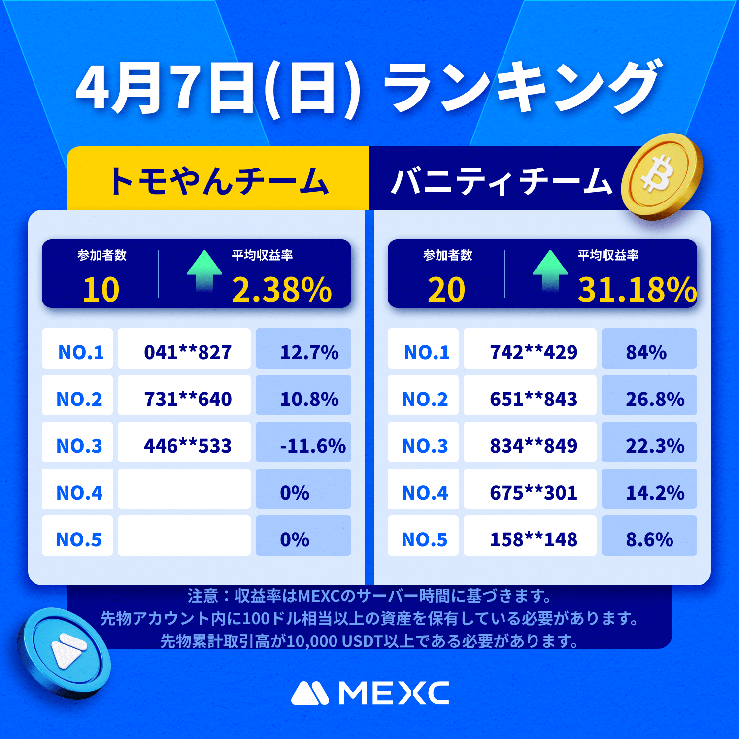 1. チーム収益率=イベント終了後、チーム内で上位5名の最終収益率の平均値を計算します。これがチームの収益率となります。収益率がマイナスの場合は、それを0として扱います。