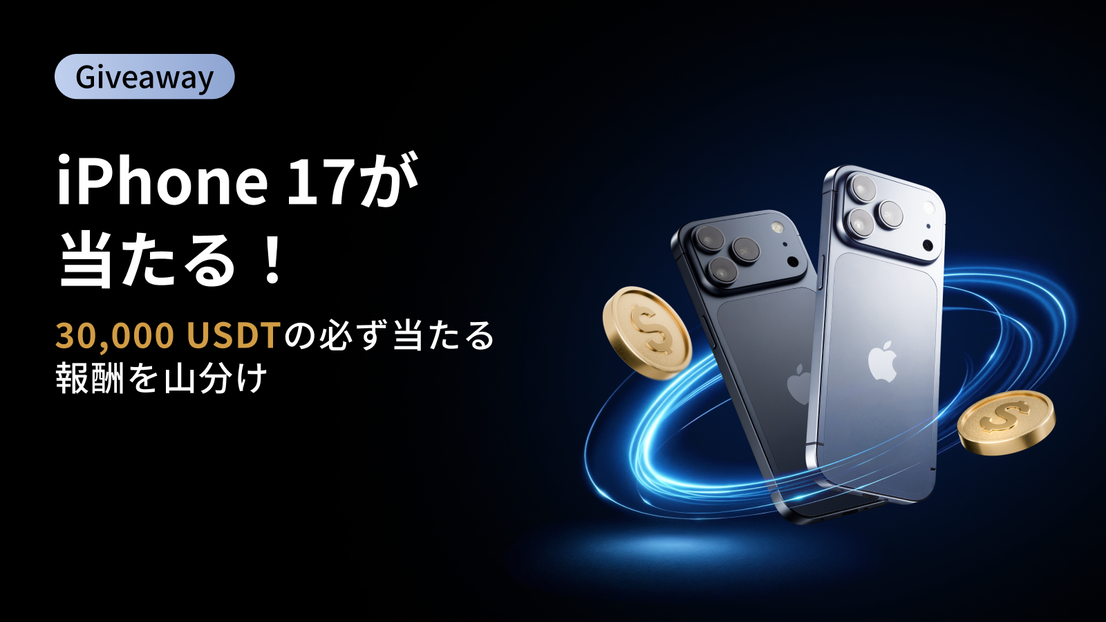 • 100%ラッキー抽選会の報酬はイベント終了後10営業日以内に配布されます。iPhone 17(本イベントでの限定1台)は約1,500 USDT相当としてUSDTで配布されます。トークン報酬はユーザー様の現物ウォレットに、先物ボーナスは先物ウォレットに付与されます。