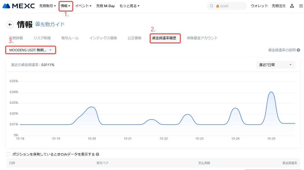 日時 (日本時間) | MOODENG USDT先物最大資金調達率 |