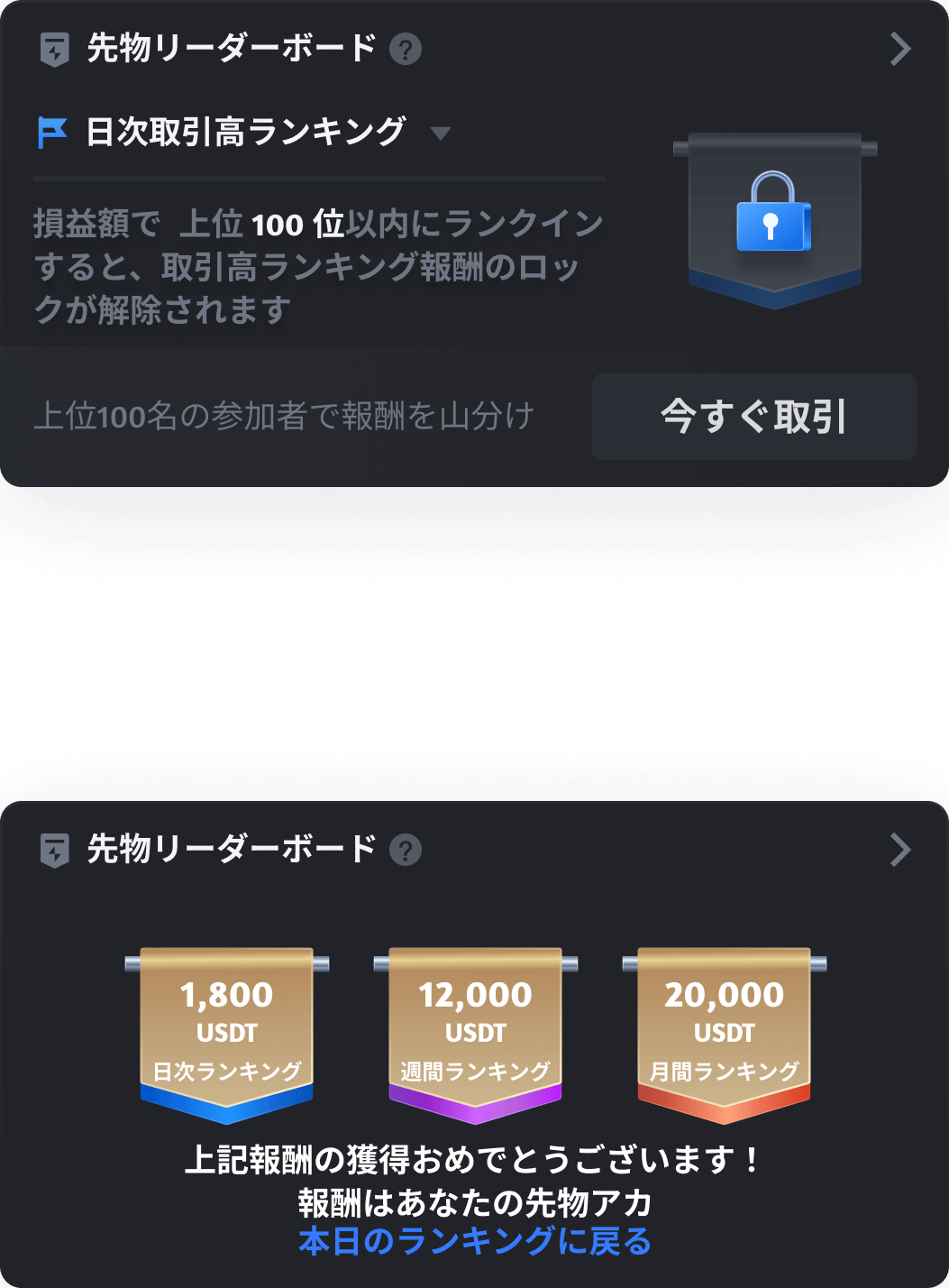 方法2:トップページにアクセスし、画面を右にスワイプして [先物リーダーボード] のイベントカードに切り替えます(アプリのバージョンが4.7.4以上の場合)。