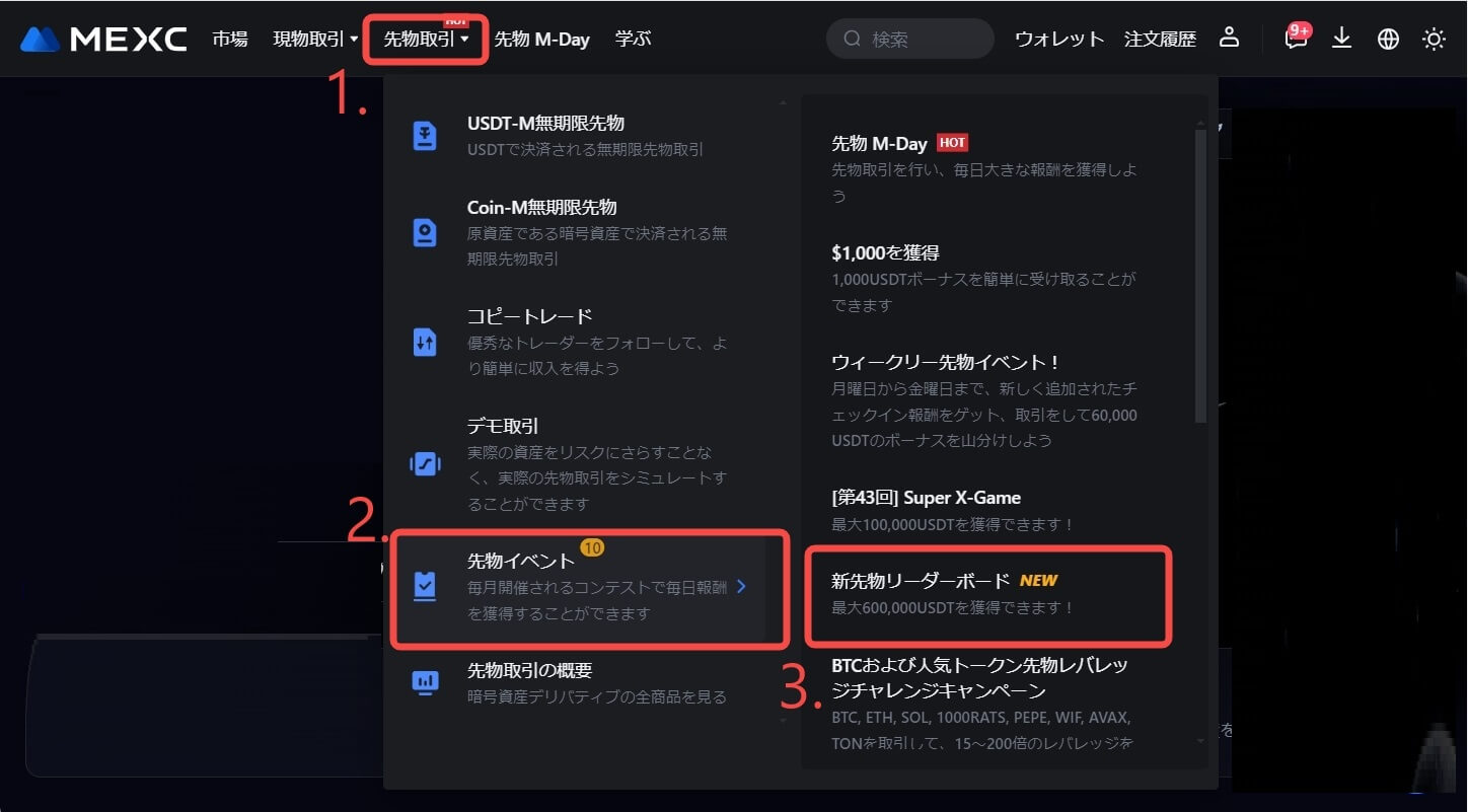 https://www.mexc.com/ja-JP)にアクセスします。次にナビゲーションバーにある [先物取引] から [先物イベント] - [新先物リーダーボード] を選択します。