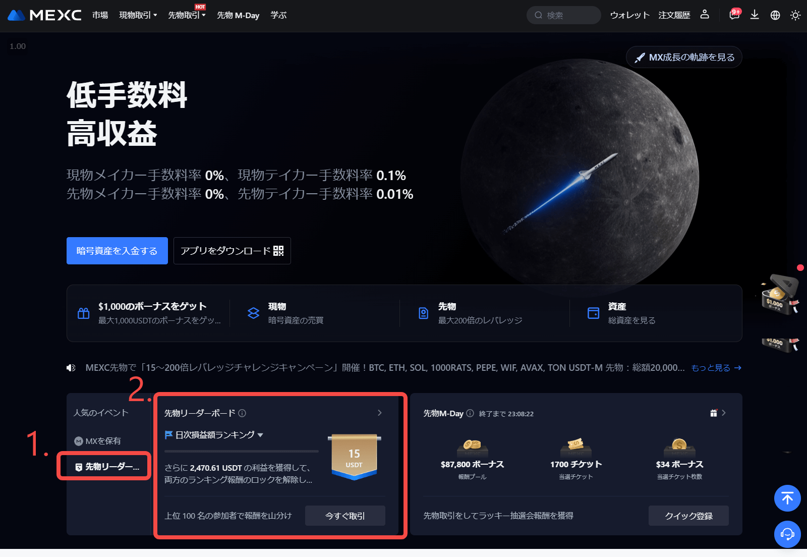 方法2:MEXC公式ウェブサイト(https://www.mexc.com/ja-JP)にアクセスします。イベントカードの [先物リーダーボード] をクリックします。