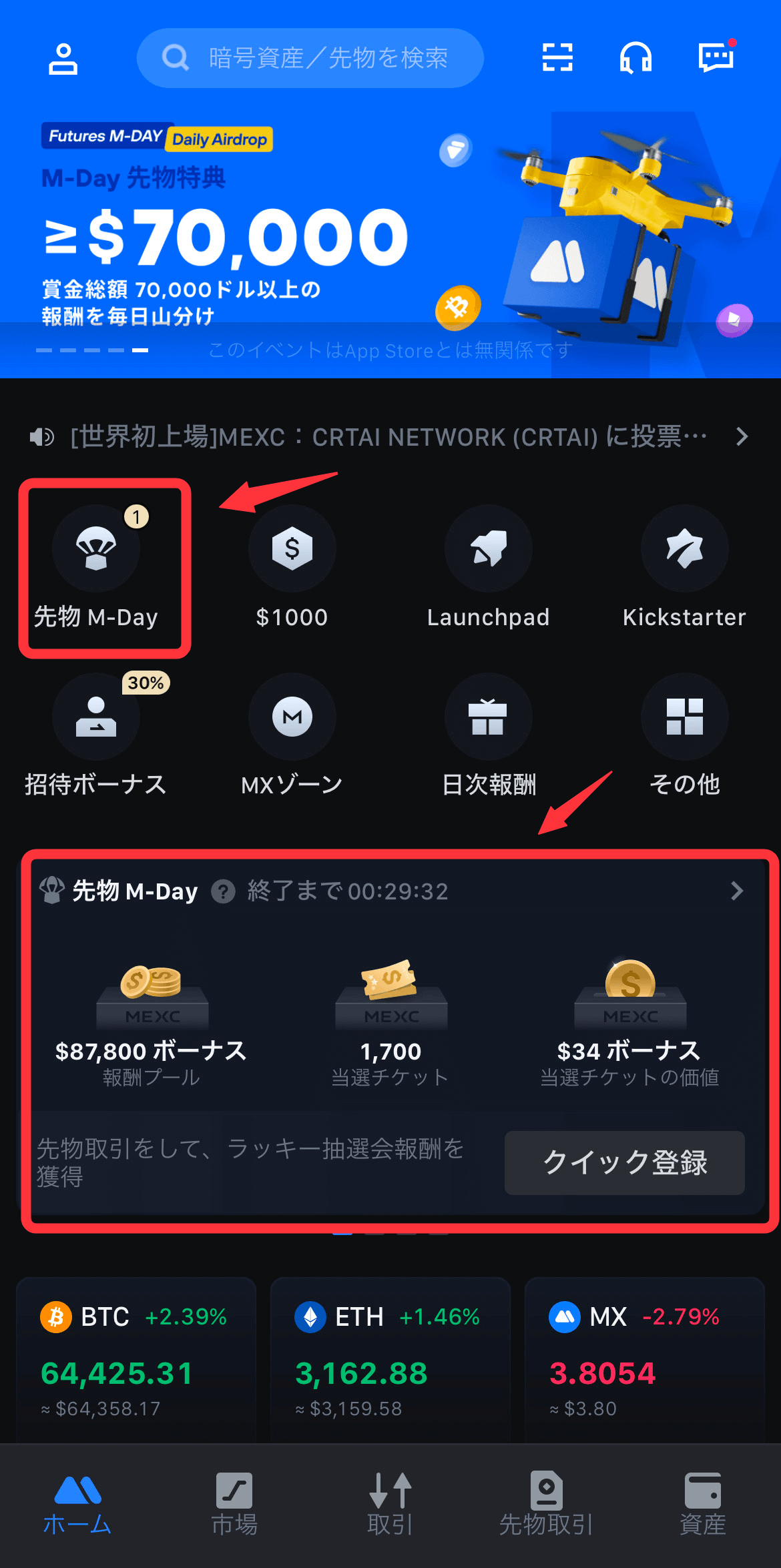 方法2:MEXC公式ウェブサイト(www.mexc.com/ja-JP)にアクセスし、イベントカードから [先物M-Day] をクリックしてください。