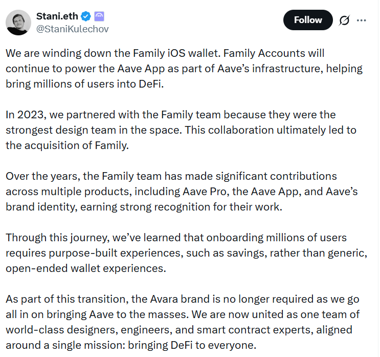 • Aave will shut down the Family wallet and operate fully under Aave Labs.