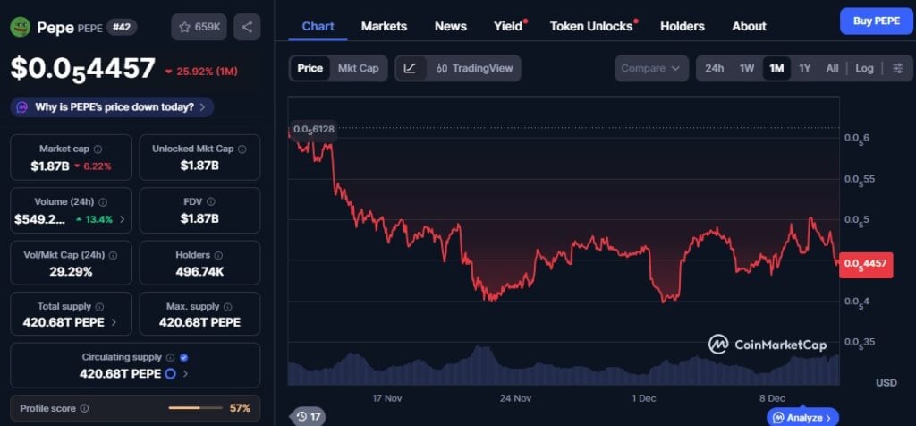 Никакое обсуждение лучших мем-коинов не было бы полным без упоминания Pepe. Это одно из новейших дополнений к топовым мем-коинам, показывающее потенциал экспоненциального роста с момента своего дебюта.