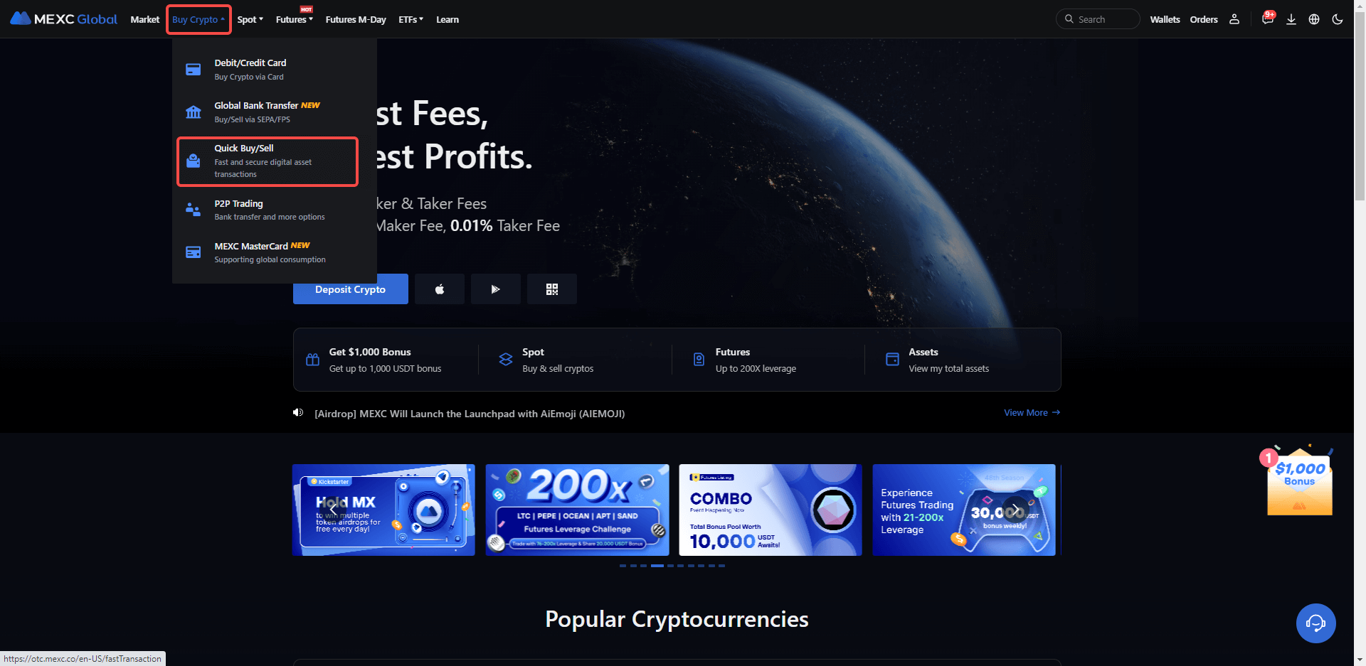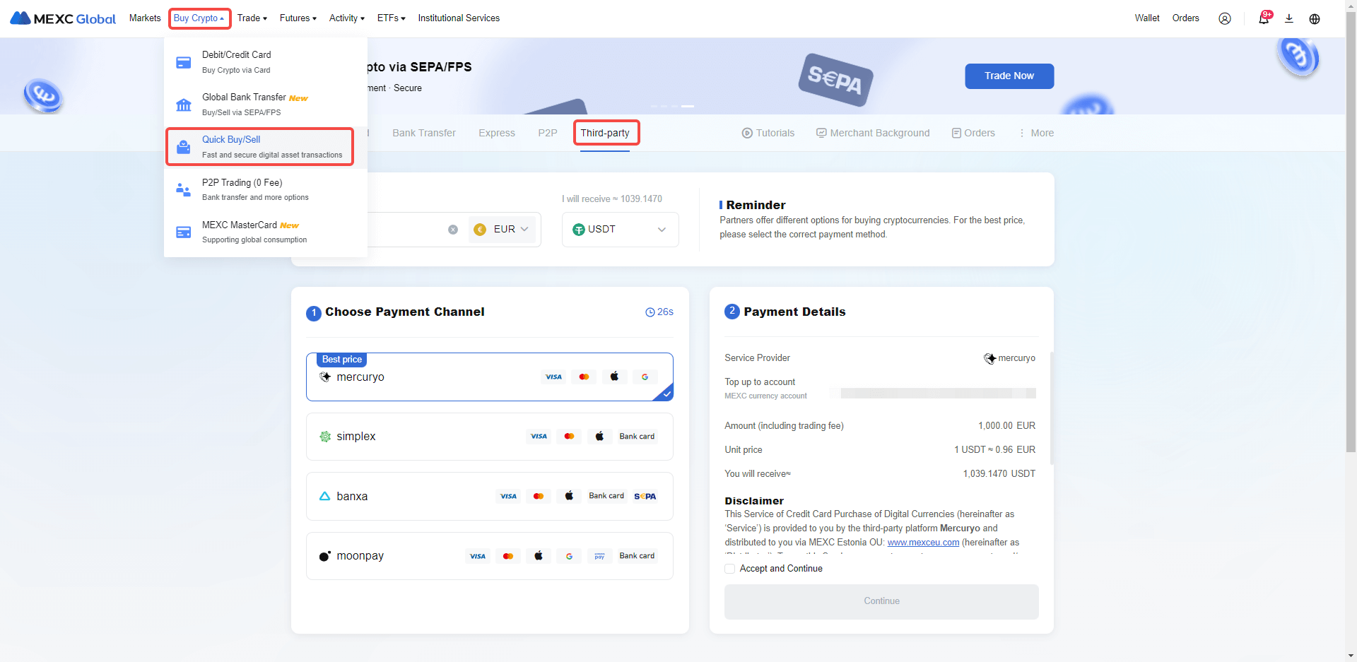 Натисніть «Купити криптовалюту» на верхній навігаційній панелі та виберіть «Швидка купівля/продаж» у випадаючому списку, щоб отримати доступ до опції «Експрес-купити криптовалюту». Потім перейдіть до натискання «Сторонній платіж».