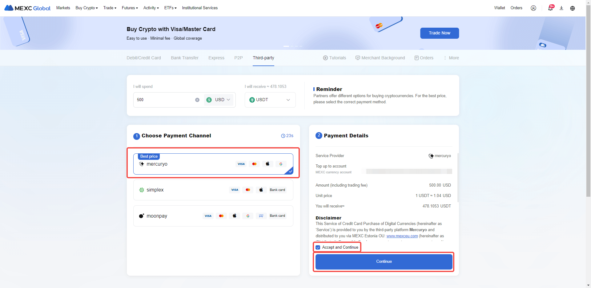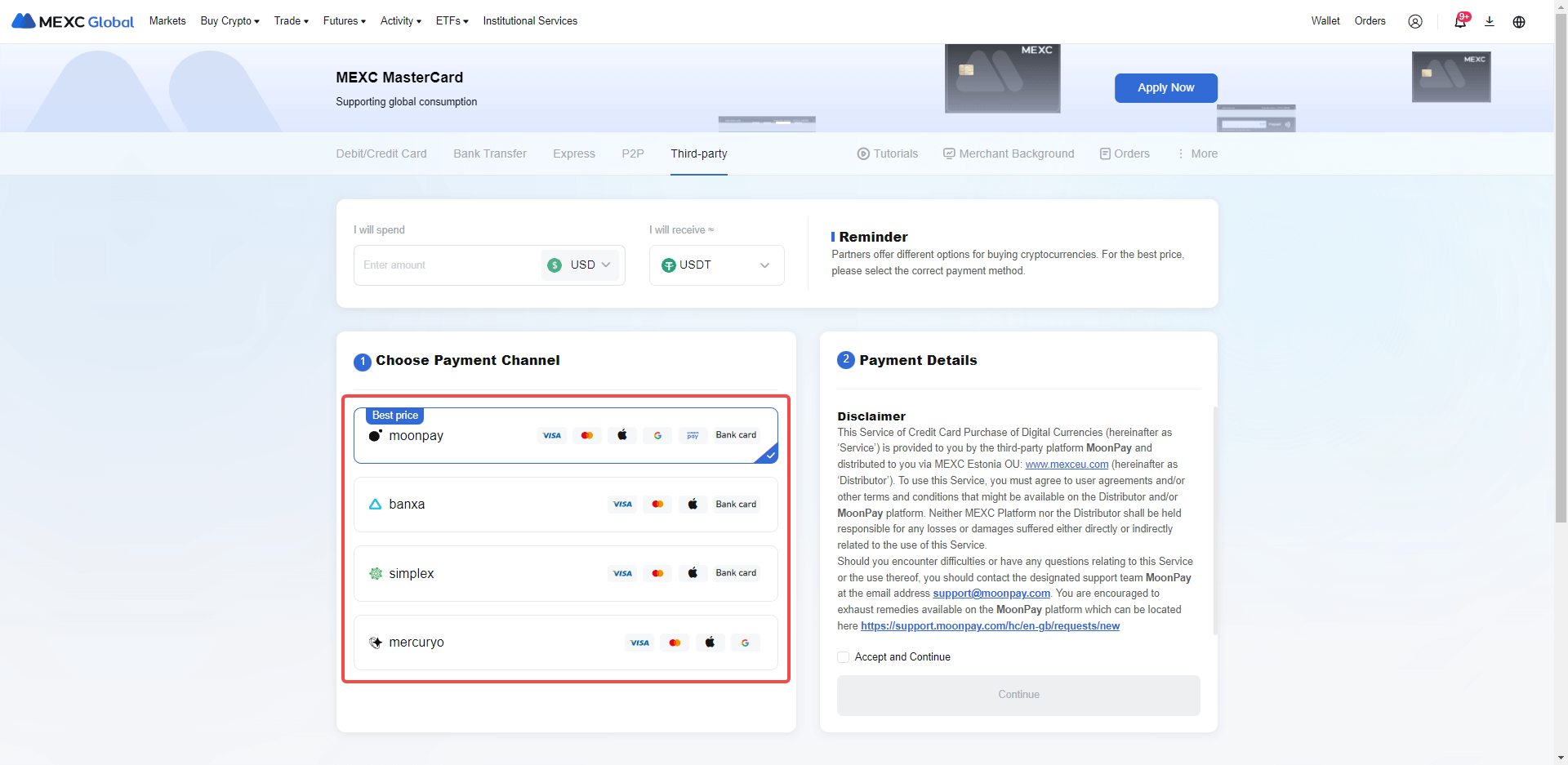 Крім того, ви можете натиснути на цю URL-сторінку: https://otc.mexc.com/creditCard