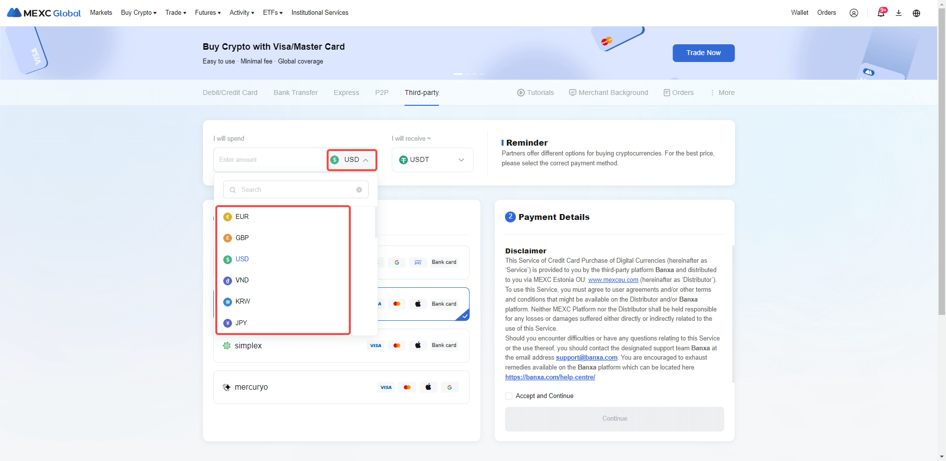 Виберіть фіатну валюту, за яку потрібно сплатити. Наприклад, у доларах США є кілька сторонніх постачальників послуг, яких ви можете вибрати зі списку, щоб отримати найкращу ціну купівлі.