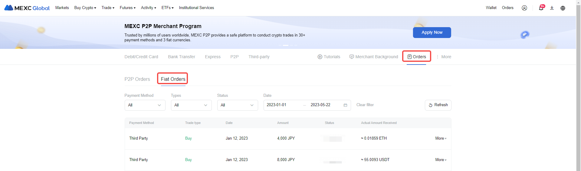На офіційному вебсайті стороннього постачальника послуг заповніть відповідну інформацію та дотримуйтесь процесу купівлі, щоб завершити транзакцію. Після того, як ви успішно придбали криптовалюту, ви можете натиснути на «Ордери», щоб переглянути історичні записи транзакцій.