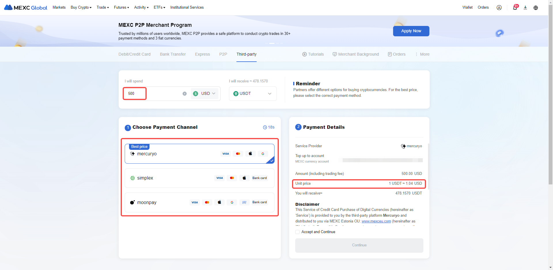 4. Коригування ліміту покупок контролюється виключно сторонніми постачальниками послуг, і ми закликаємо користувача спілкуватися безпосередньо з відповідними сторонніми постачальниками послуг. Ви можете знайти їхню контактну інформацію в розділі "Відмова від відповідальності" на нашому торговому вебсайті для сторонніх каналів https://otc.mexc.com/creditCard