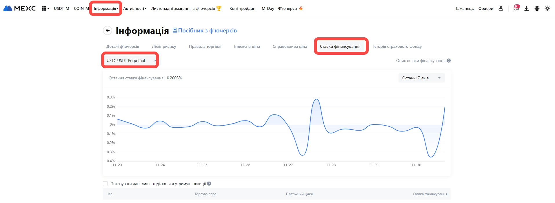 О 10:45, 30 листопада 2023 року (за Києвом) на MEXC було скориговано ліміт ставки фінансування безстрокових ф'ючерсів USTC USDT-M. Нова частота розрахунків тепер раз на 4 години. Деталі такі:
