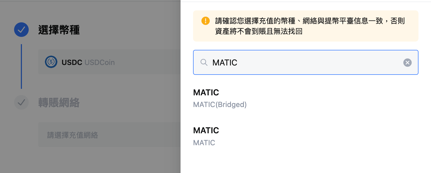 - 在充提頁面上,Polygon 網絡上原生USD Coin (USDC)代幣的網絡名稱爲 MATIC。請您在充/提值前仔細確認,以免造成資產損失。